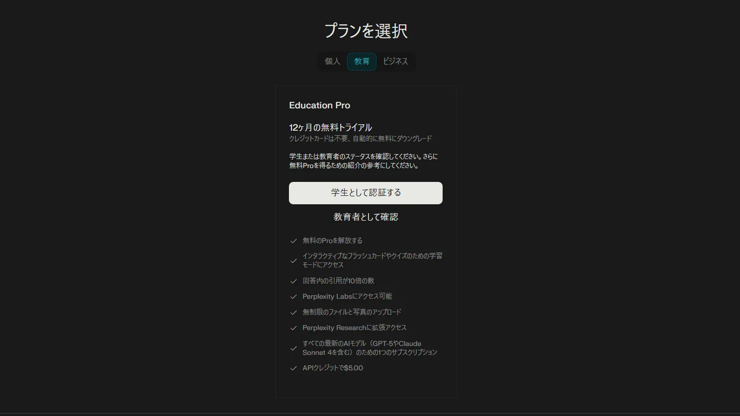 正しくは「Perplexity Education Pro」というプランが使えるようになりますが、基本的な機能は通常のProと同じです。