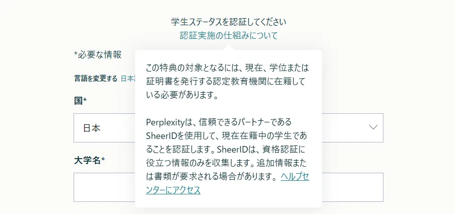 今回の Perplexity Pro 無料特典を受け取るには、SheerIDを使用して学生認証ができる大学に所属していることが条件となります。